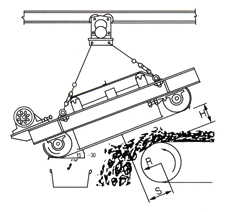 (1)设置在输料皮带机头上方除铁时,对带式除铁器须纵向倾斜安装。除铁器的主传动滚筒在低位。倾角a=15°~30°,S=R+300
