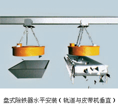 轨道方向:根据现场条件,除铁器在大皮带机头上方吊挂,其轨道可与大皮带方向垂直或同向。或除铁器在大皮带上下山段或水平段止方吊挂,其轨道方向必须与大皮带方向垂直。
